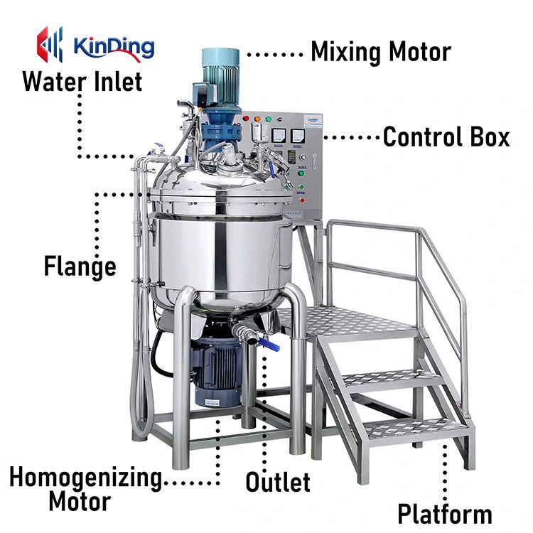 Structural features: Platform-type base (can be integrated with a control cabinet), three-layer insulated tank (inner tank SUS316L, jacket SUS304, outer protective layer SUS304), top-mounted homogenizing emulsifying head (variable frequency speed regulation), explosion-proof sight hole lamp, and sanitary breathing apparatus.